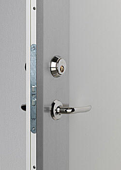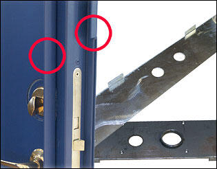 Förstärkningen av den här dörren är limmad och nitad fast - det är starkare än svetsning och deformerar inte. Den extra upphöjningen på karmen gör att ett bräckjärn inte får tillräckligt moment.